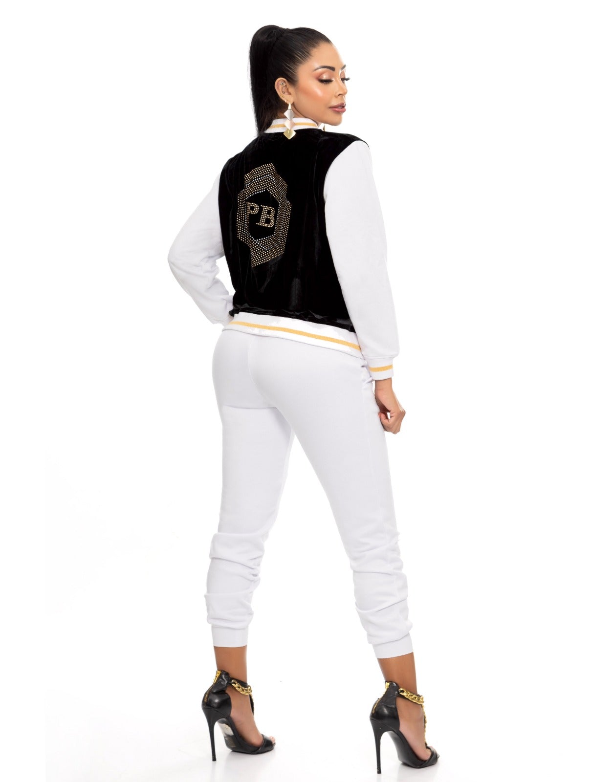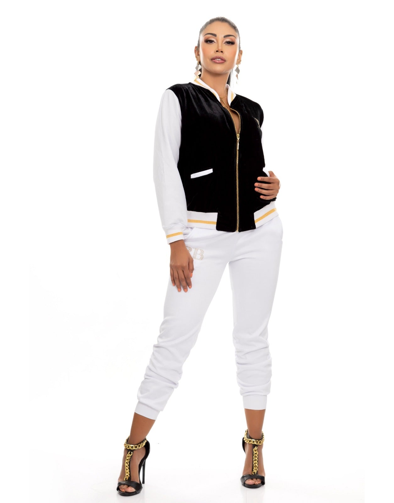 O Conjunto Pitbull Jeans foi desenvolvido para mulheres que valorizam elegância até nos looks casuais. A jaqueta em veludo dourado/preto traz um brilho suave e luxuoso, contrastando com as mangas brancas em tecido confortável, criando um visual moderno. O acabamento canelado na gola, punhos e barra garante um caimento perfeito, além de deixar o look mais estruturado.